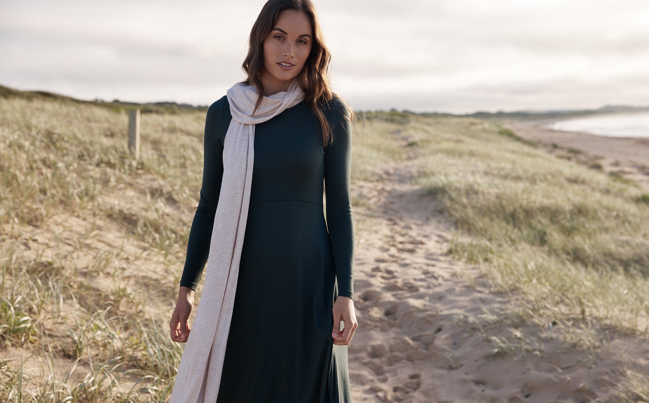 The SERENITY AW 2024 collection is an invitation to find warmth in the coolness, comfort in the quiet, and elegance in simplicity. Inspired by the serene landscapes of country and seaside retreats, the styles within this collection breathe life into the muted, cozy hues of forest green, burgundy, storm grey, and dark navy, seamlessly intertwined with a bold statement of true red. This palette, a reflection of winter’s unique beauty, evokes a sense of calm and warmth, ideal for layering and crafting looks that are as multifunctional as they are stylish.Imagine yourself cocooned in the softness of our bamboo pieces, strolling along the beach or meandering through the countryside, where the air is crisp, brimming with the promise of warm family gatherings. The Serenity collection is crafted for these very moments—featuring cozy winter dresses, snug long sleeves, comfy pants, flowy skirts, and cardigans that feel like a hug, all meticulously crafted from our signature buttery soft and sustainable bamboo fabric.Capturing the essence of slowing down and the peaceful moments of the colder season, the Serenity collectionoffers comfort, warmth, and understated elegance to your winter wardrobe.