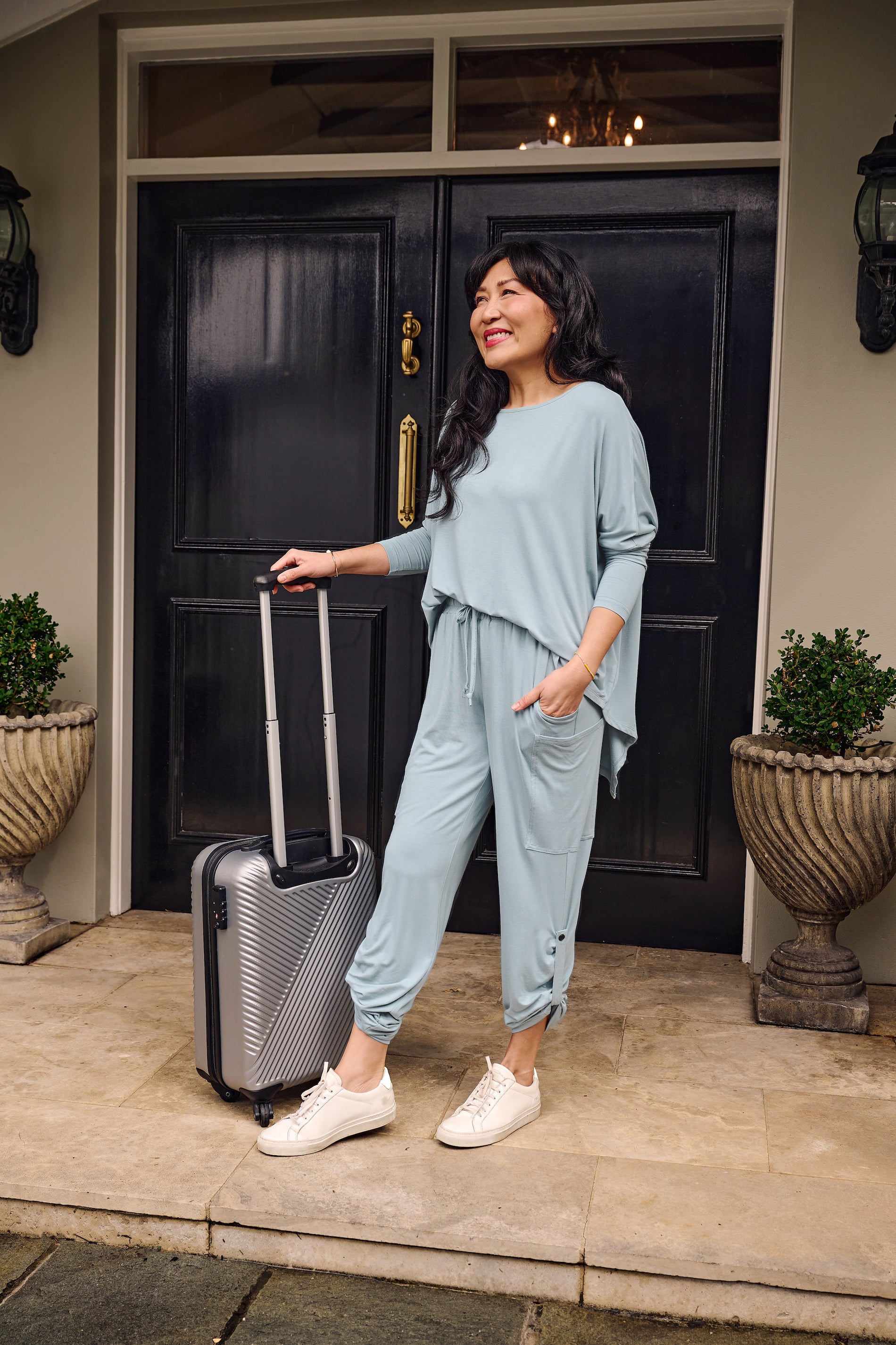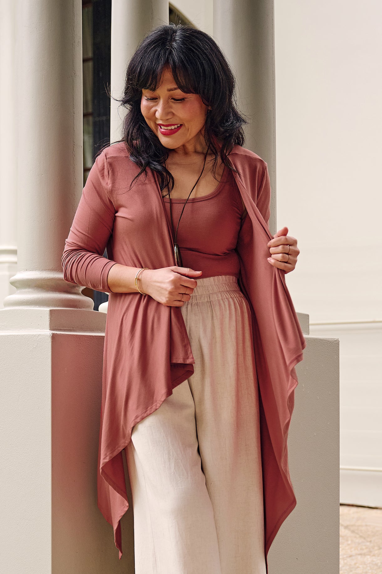 Pair your new pieces effortlessly with our Bamboo Linen Collection or with trusty basics like the Pocket Pants in Bone and Chocolate, Essential Pants, Essential Skirt, and Voyager Pants and Skirt. Mix, match, and create endless combinations that work for your summer.
