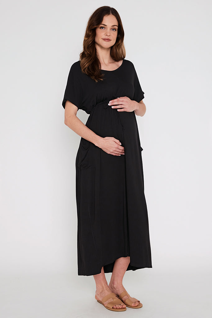 This breathable bamboo fabric dress is perfect for mums to be! It gently moves with your body and is light and airy for the hot summer days. It's relaxed in fit, features a scooped v neckline and has a drawcord around the waist. With multiple colours to choose from, the Mila Maxi Maternity Dress is sure to get you compliments everywhere you go!