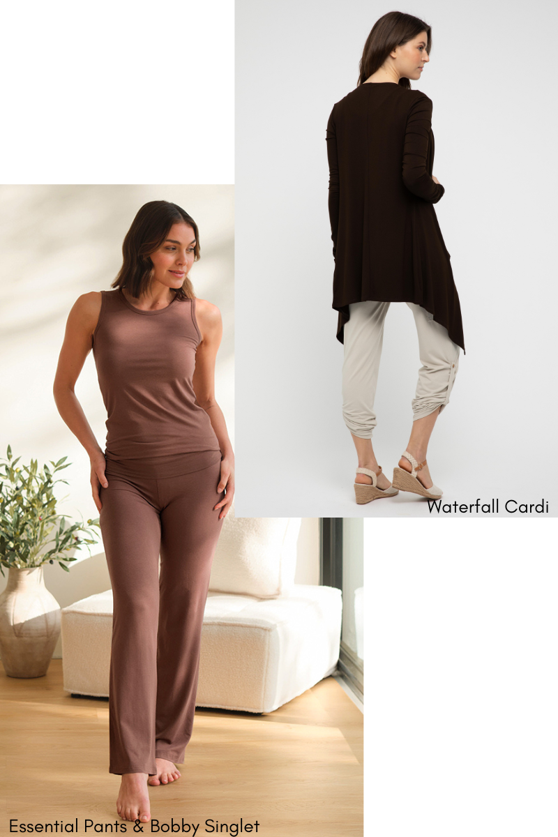 Combining two warm tones is always a winner — and Chocolate with Mousse is no exception. The deeper Chocolate shade adds a lovely contrast while keeping the look soft and earthy. And honestly, who can resist something called Chocolate Mousse? Try adding our Waterfall Cardigan in Chocolate over a Mousse outfit like the Essential Pants and Bobby Singlet for an extra comfy lounge look you’ll want to live in.