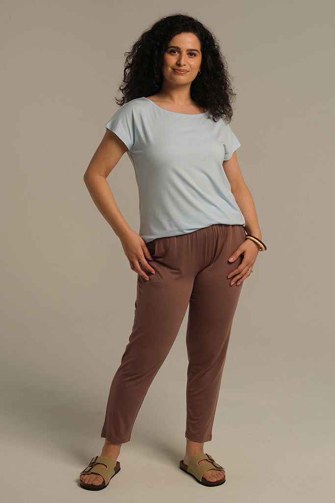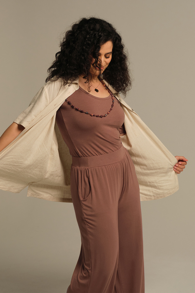 If you’re feeling bold, try the ultimate combo — Mousse on Mousse. Matching your Mousse pants with a Mousse top creates an effortlessly chic, tonal look. Add a long beaded necklace for a bit of contrast and interest, or throw on an extra layer like our Sahara or Noosa Shirt to break it up while keeping things light and easy.