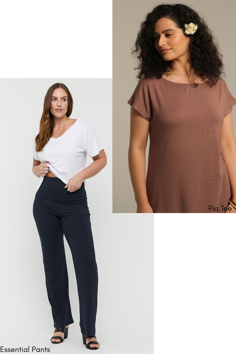 Dark Navy is one of the most versatile colours in our collection, it goes with literally everything. It also adds a touch of sophistication to Mousse, so you can easily dress it up. Take Bernadette’s pick: the Tilly Pants in Mousse with our Bamboo V-Neck Tee in Dark Navy. Or flip it — try the Essential Pants in Dark Navy paired with the Pia Tee in Mousse. Honestly, the combinations are endless, just mix and match to suit your day.