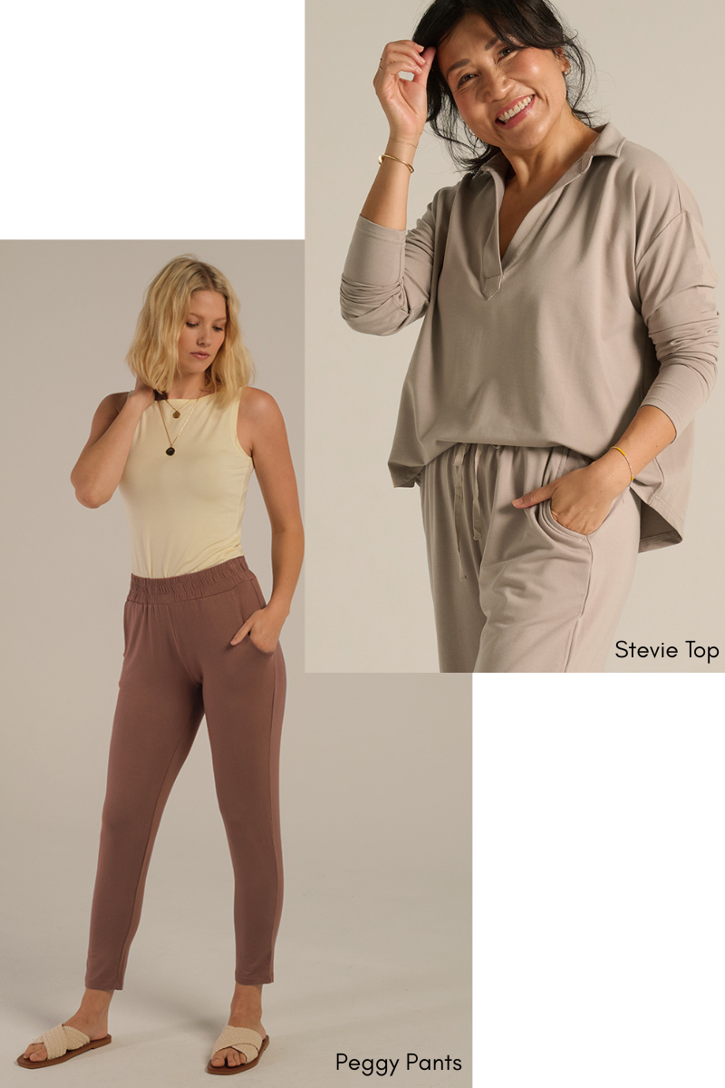 For a warm, tonal look, try mixing Mousse with Taupe. Our Taupe shade is made in a thicker terry bamboo fabric that adds structure and warmth — perfect for the cooler months. Together, these colours create that laid-back vibe that’s ideal for travelling, everyday errands, or relaxing at home. Bernadette loves the Terry Relax Boatneck in Taupe, but you can also try the Stevie Top or Voyager Pant in this neutral colourway.