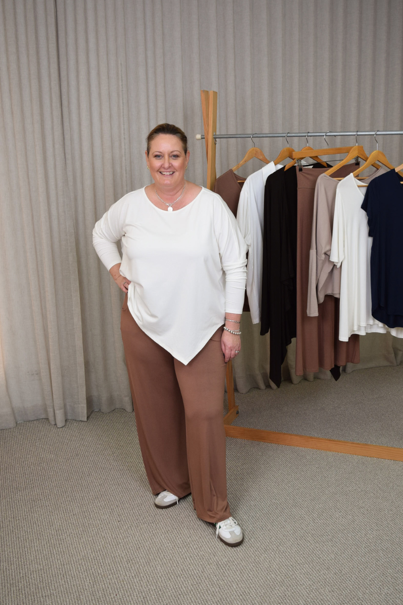 Bernadette keeps it fresh and relaxed in the Tilly Pants in Mousse paired with the Terry Relax Boatneck Top in Soft White. It’s a casual, everyday look that blends soft, warm tones for an effortless outfit you can wear on repeat. Perfect for coffee runs, working from home, or lounging in style.