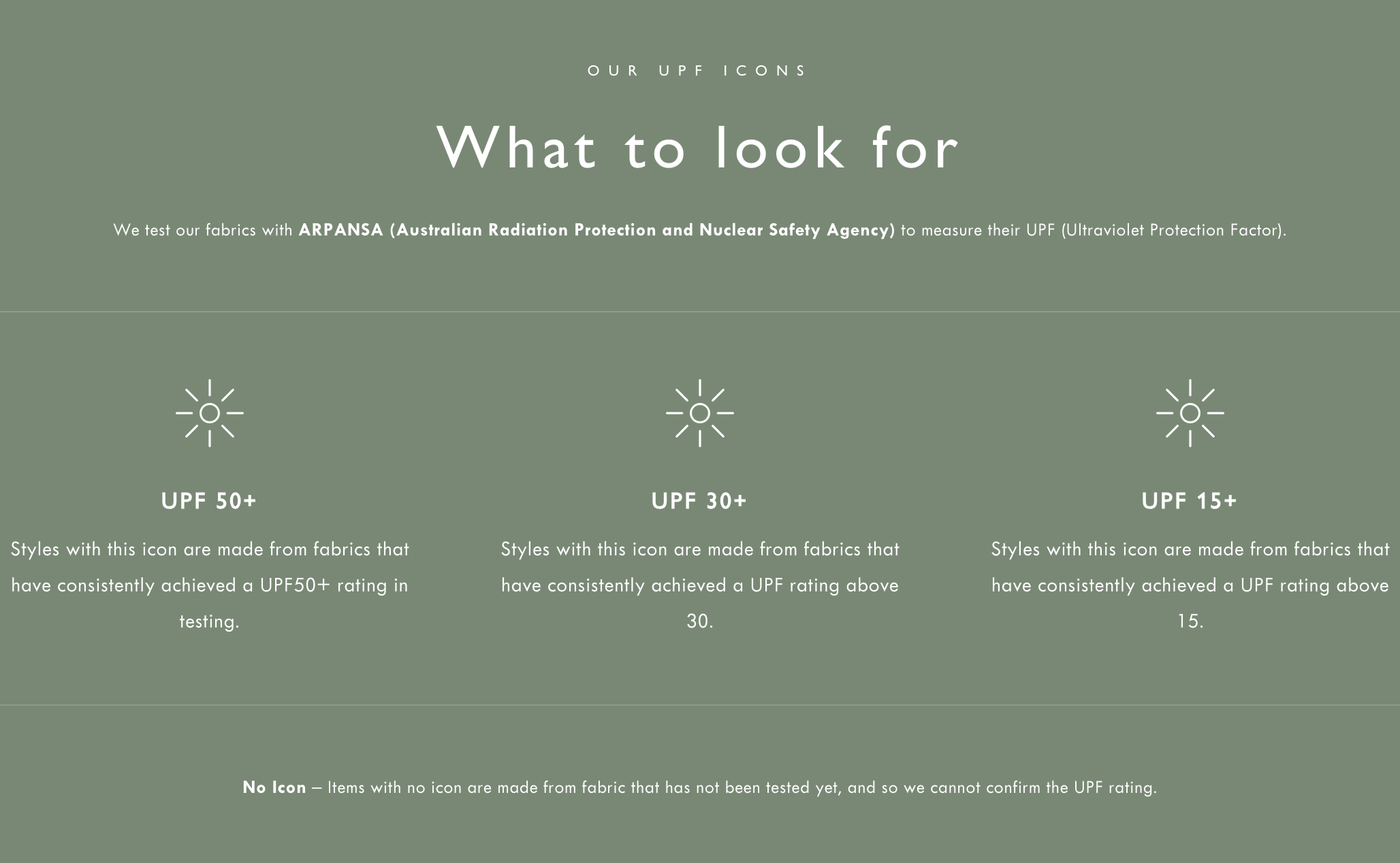 To help you explore our fabrics more closely, you can familiarise yourself with our fabric range. You’ll also notice UPF fabric icons across our website, which make it easy to understand the protection factor of each material at a glance.