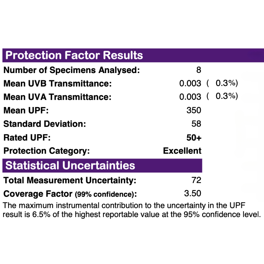 In the result table below you can clearly see that the Mean UVB and UVA transmittance is 0.3% which is very low. The UPF is 350, which falls into the UPF50+ excellent protection category.
