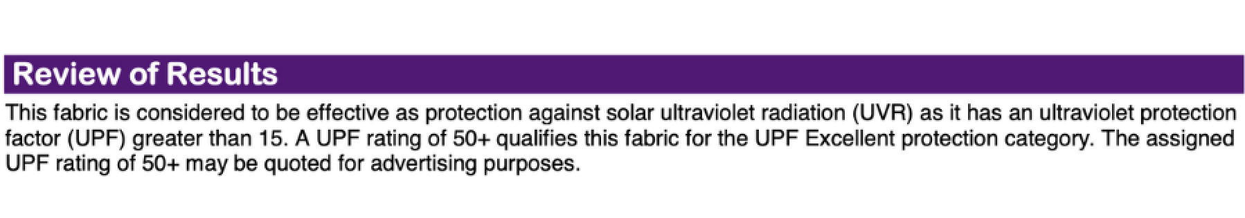 The outcome was something we were proud of: every single fabric tested achieved the highest possible result — UPF50+ (Excellent Protection)