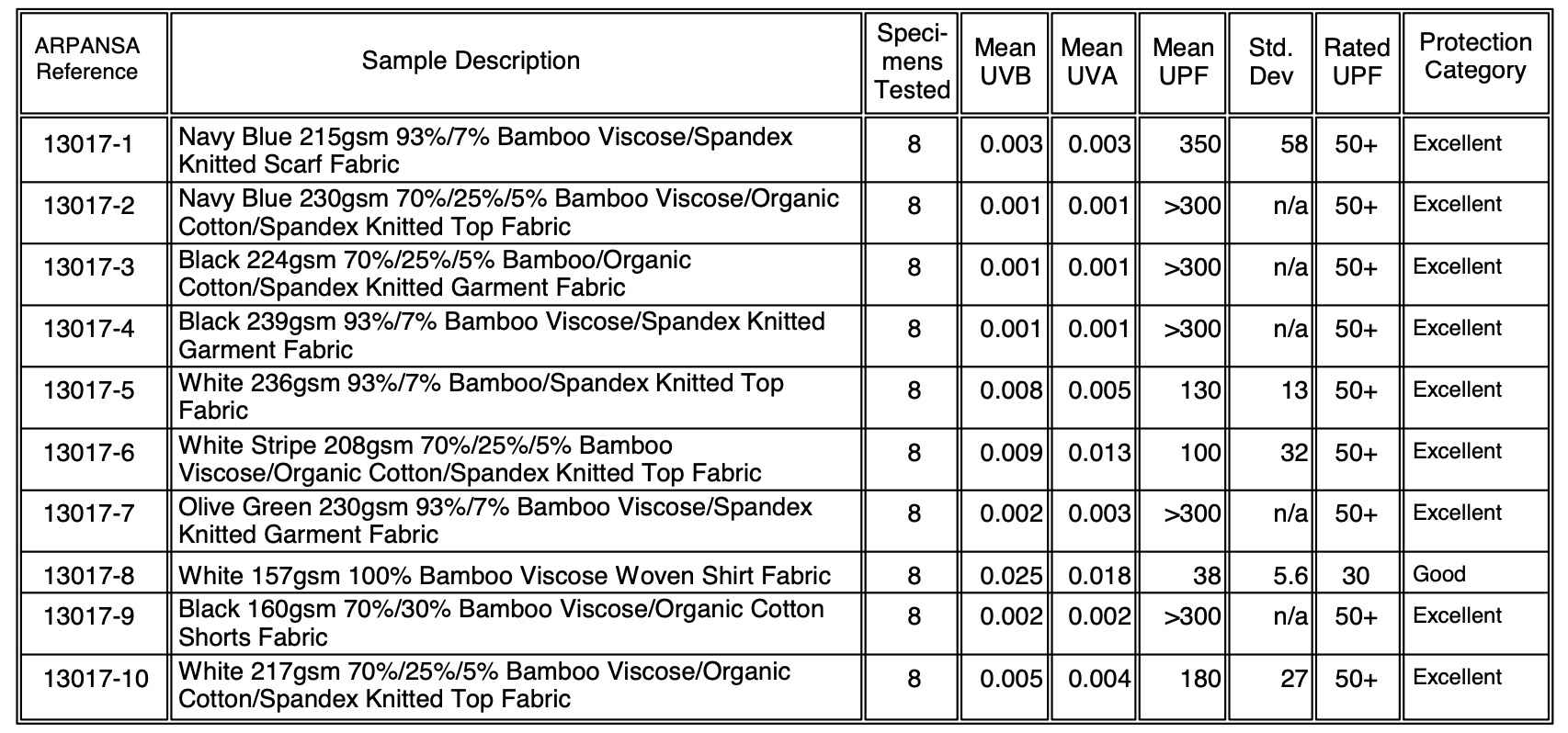 And if you’d like to shop only our top-rated options, we’ve created a dedicated UPF50+ page, where you’ll find all Bamboo Body fabrics that achieved a UPF50+ Excellent Protection rating.