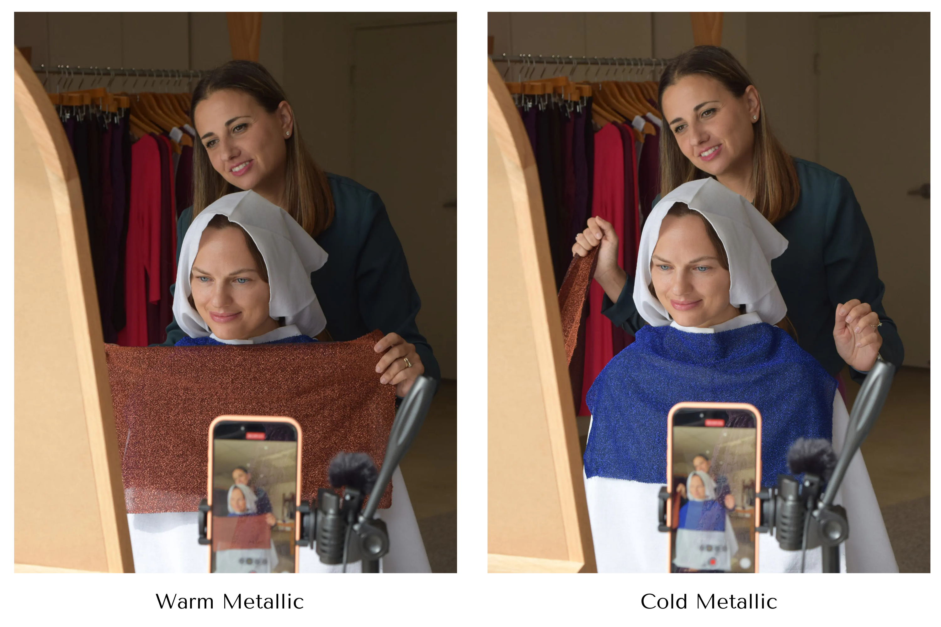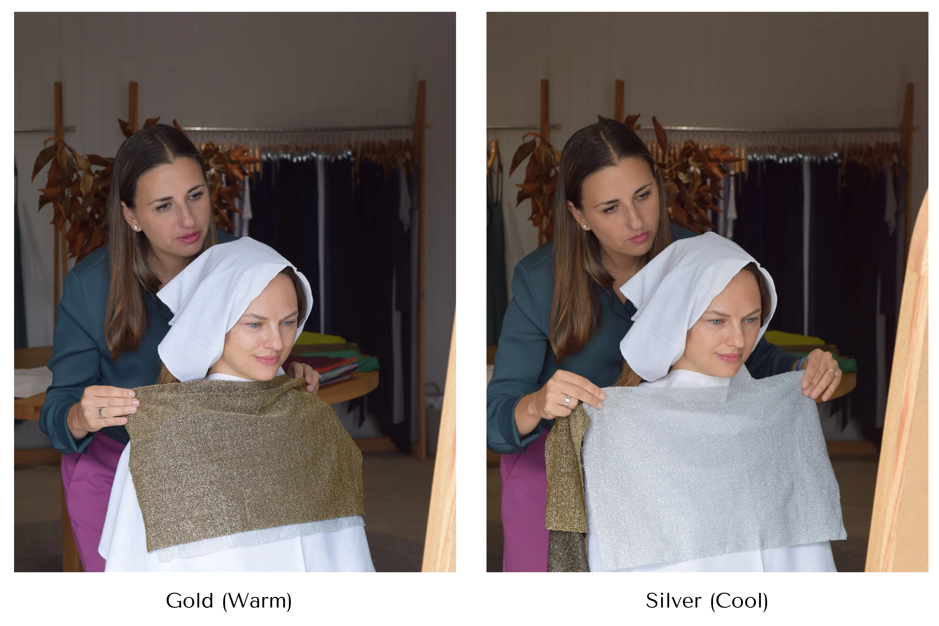 The first step of colour analysis is identifying a person’s undertone, which can be warm or cool. Silvia does this by applying a set of swatches – first cool, then warm tones of the same colour. “It’s not just about the colour; it’s about the light. Light interacts with colour, and the way colour reflects on the skin makes it clear whether the complexion has a warm or cool undertone,” says Silvia. Sometimes, it’s more obvious in people, sometimes it’s not, but in my case, everyone agreed – I definitely look fresher, more vibrant, and glowing in cooler shades. The control step – applying silver and gold swatches – proved that silver is definitely my colour. Oh my, I’ve always worn gold jewellery…. Silvia says that it is the most expensive truth that she has to tell her clients. This step narrowed down my colour season – I’m either Winter or Summer, which are 2 cool seasons.
