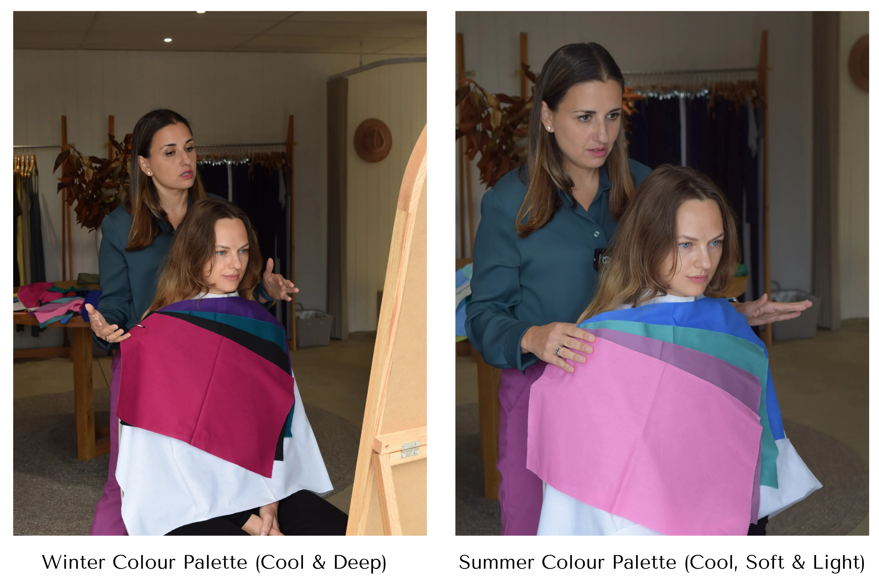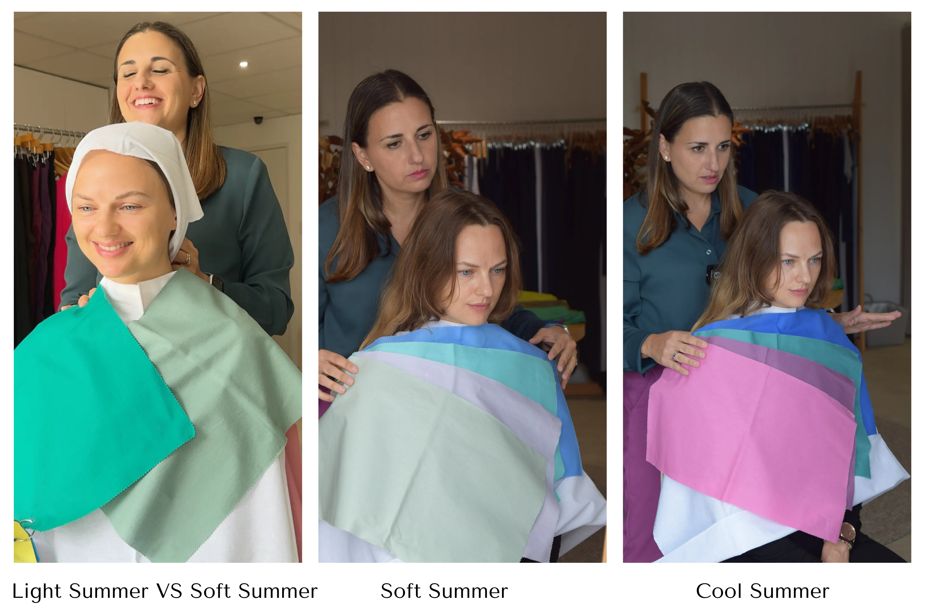 I don’t have a strong contrast between my hair and face colour. Even though my eyes are a bright blue, they’re still light in colour. When you think of high contrast features, imagine very dark black hair against fair skin. My hair is a cool mid-brown, and my complexion isn’t super fair. To determine which season I belong to, we needed to try colour palettes from both Winter and Summer and see which looked more flattering and natural with my features. Silvia mentioned that Winter colours might be a bit too dark and bright for me, whereas the Summer palette looked fresh and complemented my features beautifully. So now it’s clear that I’m a Summer! What’s the next step?