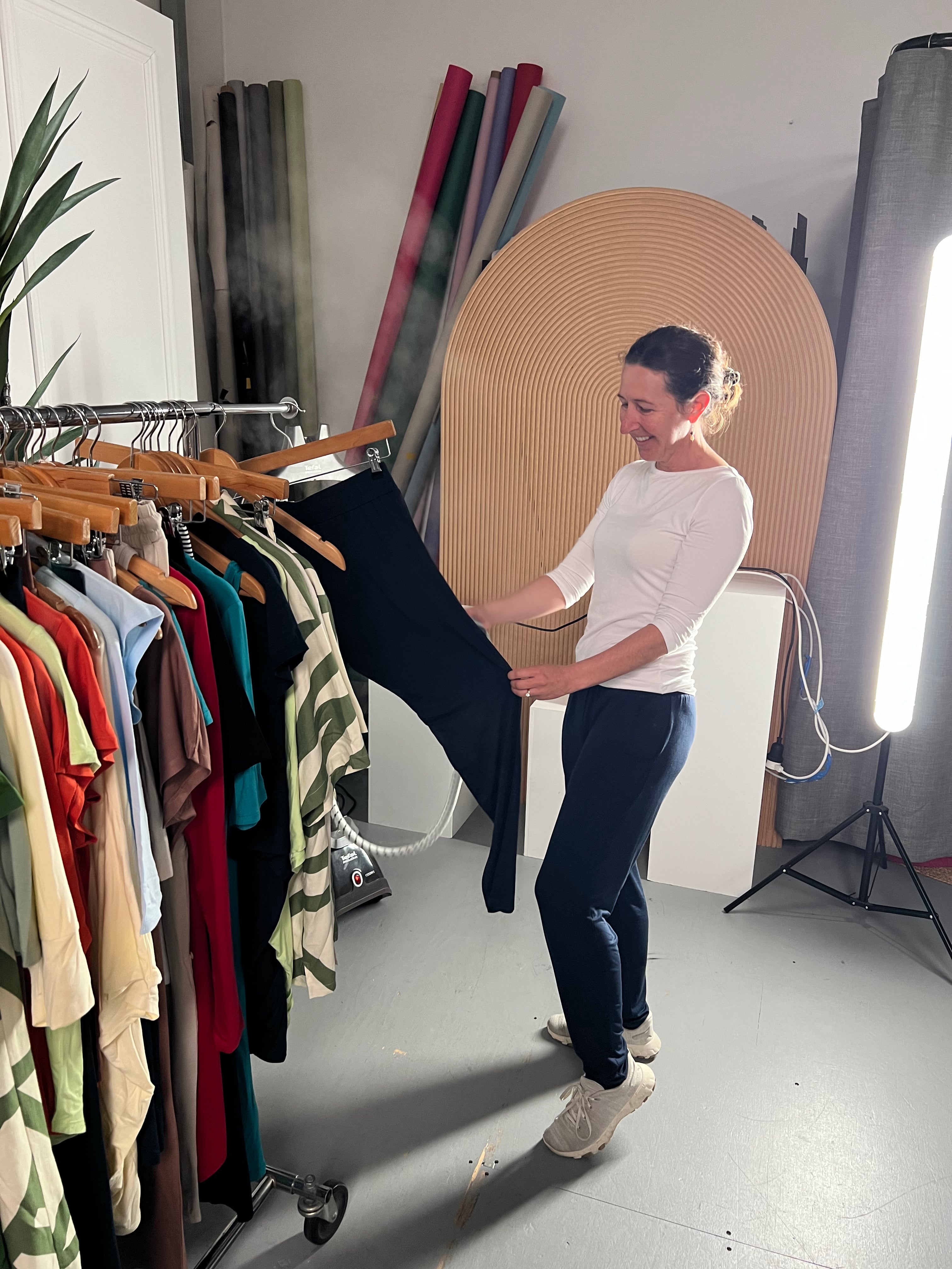 Today we are shooting the BB Spring Summer collection, an exciting day! Shoot days are very busy and I am on my feet all day. It is important to feel comfortable and unrestricted and to be prepared for changing weather and temperatures. My go-to for photoshoot day is always an Ada and often the Peggy Pants. I absolutely love my new dark navy Peggy Pants so I was keen to wear these again today. Paired back with white sneakers they have a much more causal look and feel.