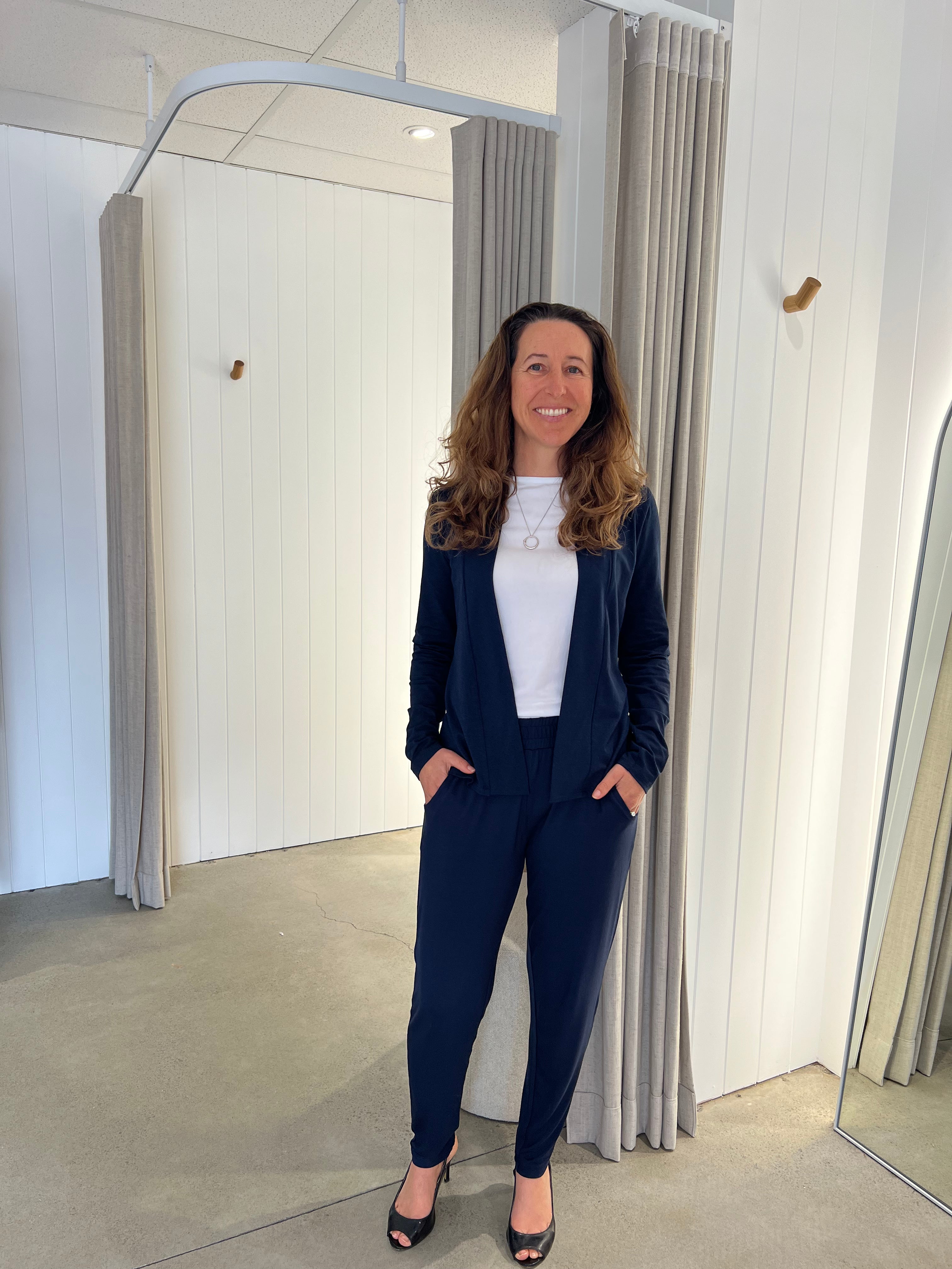 Peggy Pants in Dark Navy with the Everyday Cardi in Dark Navy.