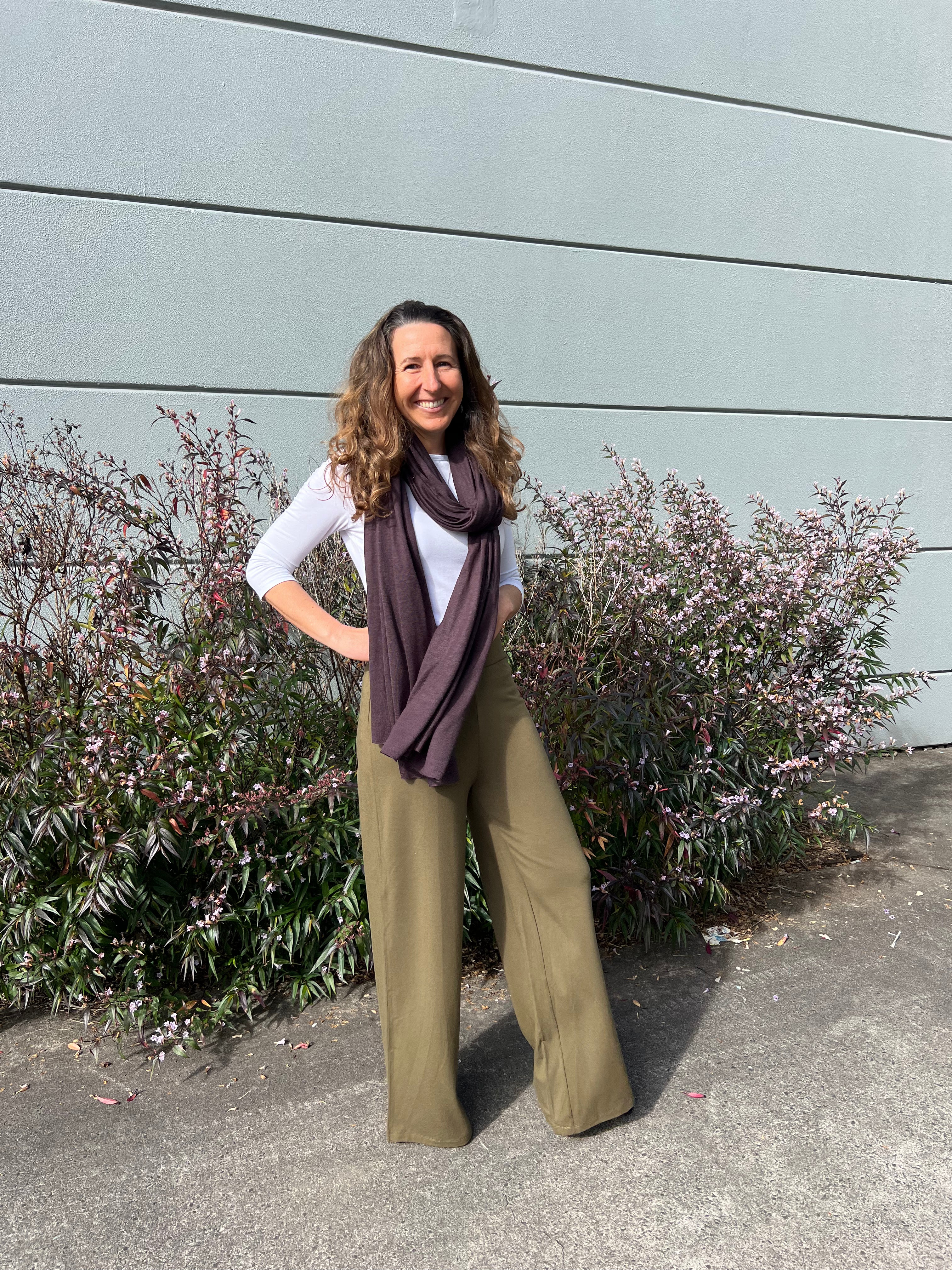Today I have warmed up the colour palette by including dark olive and cacao. The Eva Pants have a wide leg and pairing back with a fitted style like the Ada Boatneck adds balance to the outfit.
