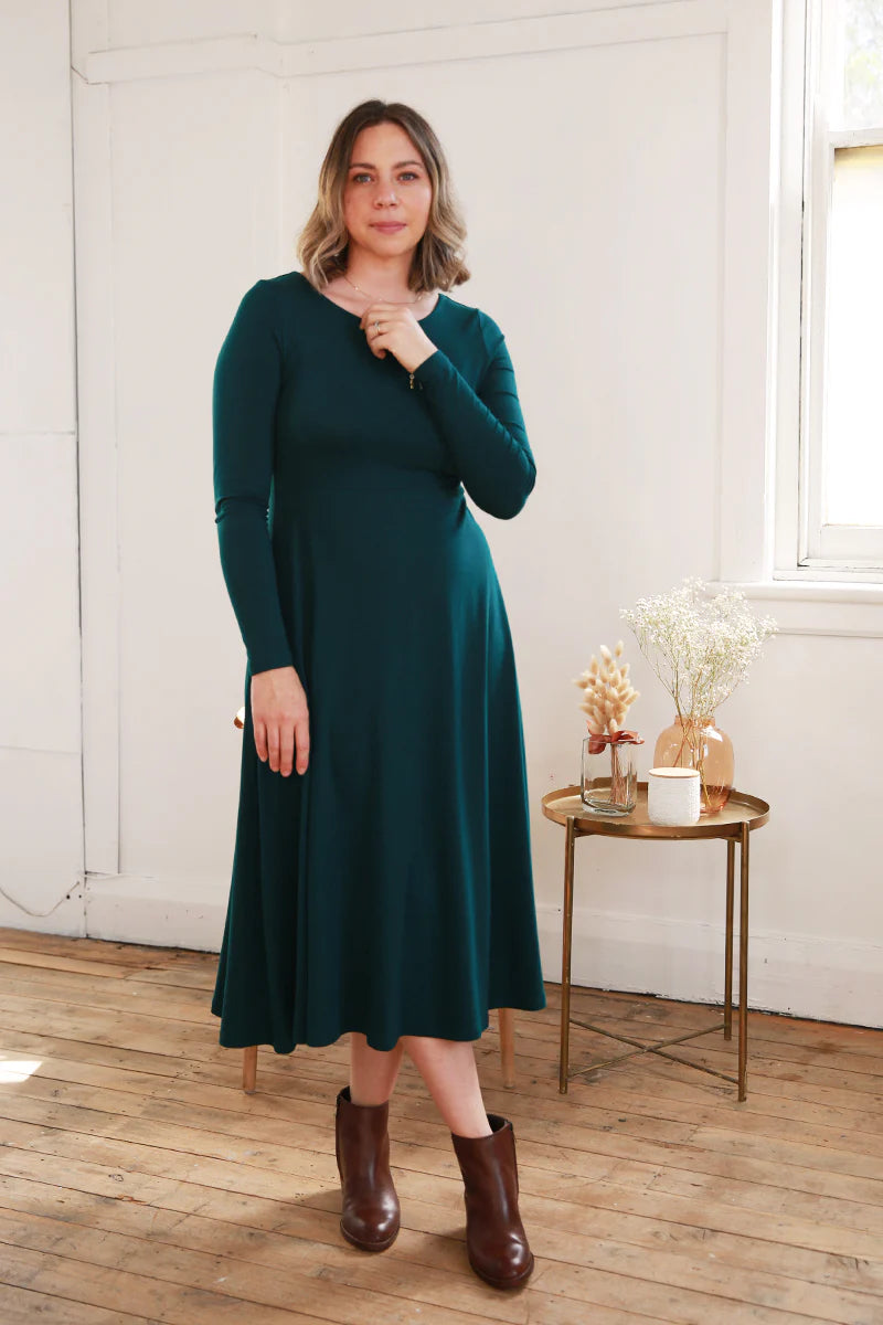 Emma wears the Olivia Dress. Shop dress styles for a pear shape below.