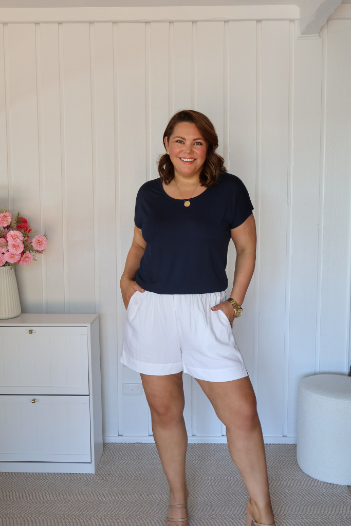 Relaxed, flattering and easy to wear, the Eadie Top in Dark Navy paired with our Noosa Shorts is a combination you'll reach for again and again. Perfect for everything from beach days and brunch dates to running errands, this effortless pairing is as versatile as it is comfortable. The Eadie Top, a much-loved style among our customers, features a wide round neckline, short sleeves and a relaxed, boxy fit that drapes softly without clinging. Stace styles it with our bamboo linen Noosa Shorts - a crips White essential designed with a wide, stretchy elasticated waistband for all-day comfort, plus practical side pockets. The timeless white shade makes them easy to pair with any tee in your summer wardrobe, while the bamboo and linen blend offers a beautiful balance of breathability, softness and understated elegance.
