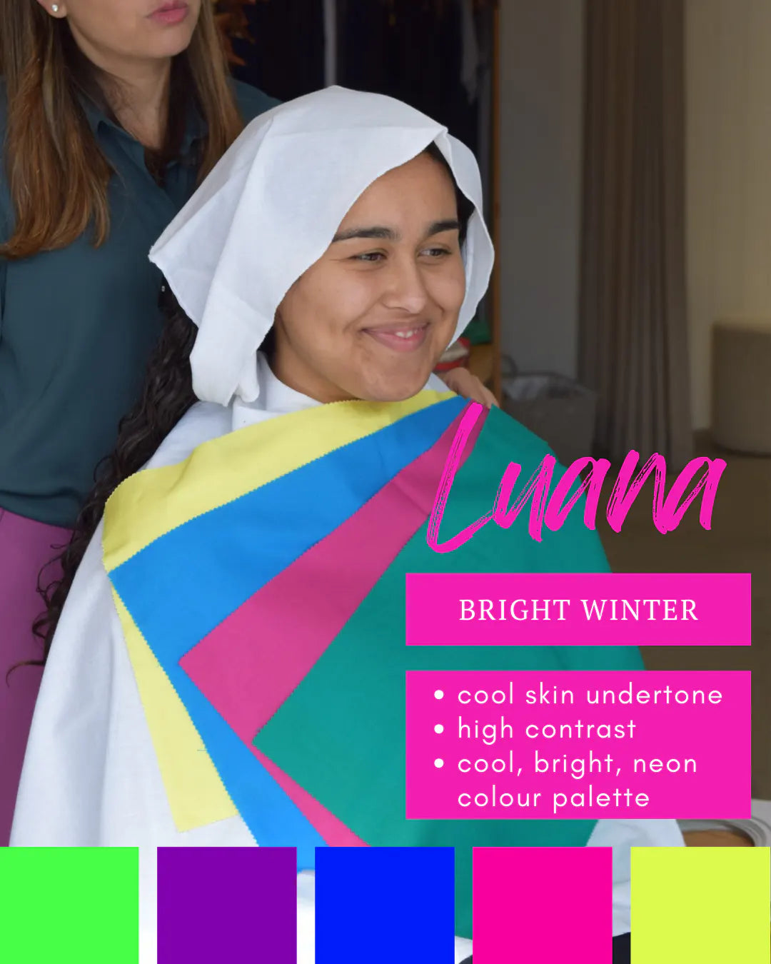 This is where the beauty of colour analysis comes into play. Despite sharing the same season, their colour palettes will vary depending on their contrast levels. Luana, with her high contrast, and Elouise, with her medium contrast, will have distinct palettes that highlight their unique features.