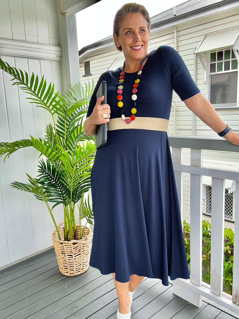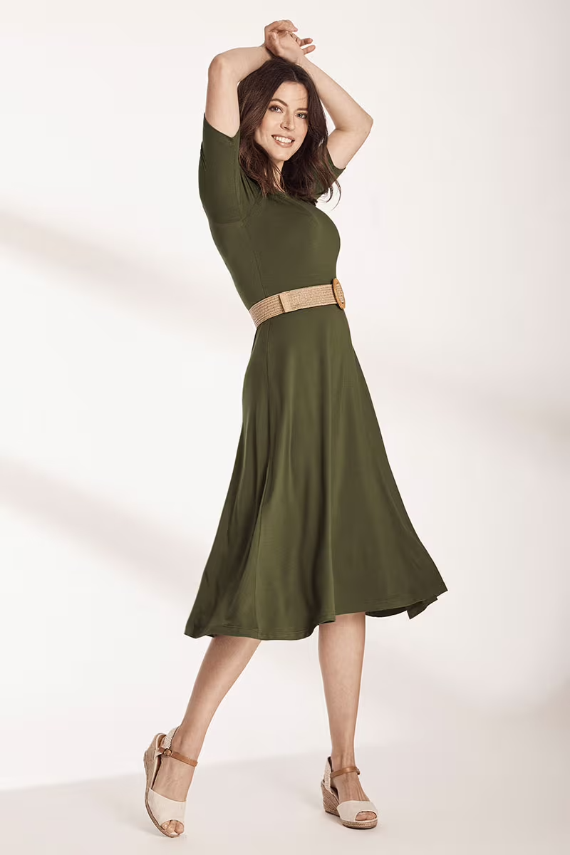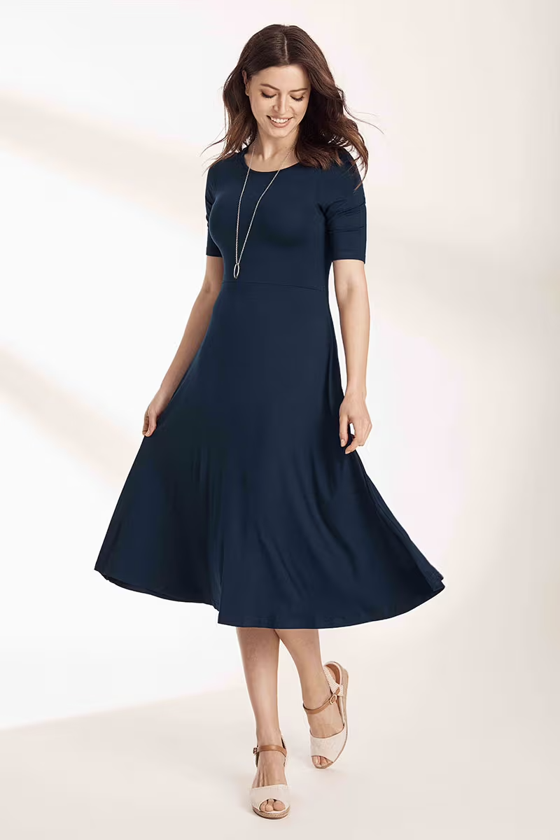 With a round neckline, fitted bodice and full skirt, the Harmony is the chic and feminine work appropriate silhouette you've been looking for! We guarantee that you will feel comfortable and confident in the super soft waistband, so you will look good and feel good even on a long work day. The sleeves stop just above the elbow, perfect for all seasons. Pair casually with a denim jacket, or a Drape Cardi and wedge heel for a more professional look.