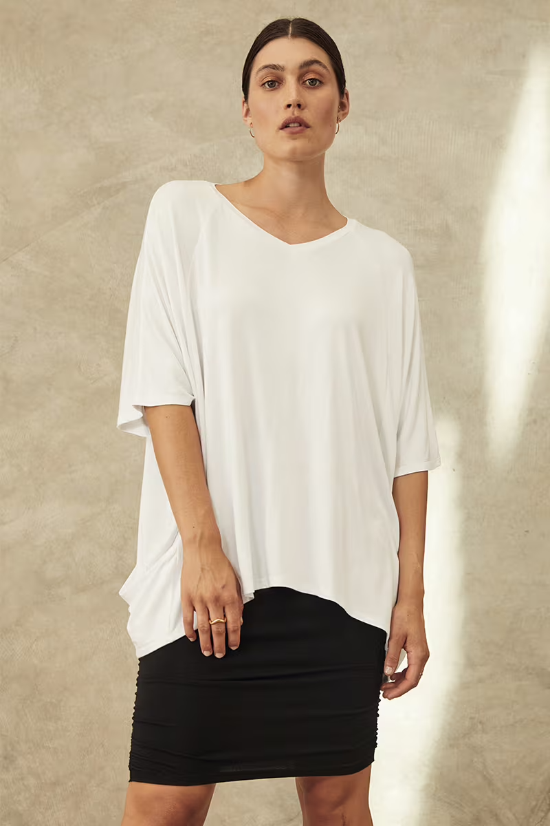 The Mara is such a fun top to play with for work. Whether you opt for a midi or maxi skirt, this is a chic, casual look for teachers, creatives and anyone in between! With a modern, batwing-sleeve silhouette and oversized boxy fit, the Mara Top can be dressed up or down to take you from the office to dinner in the city. Team with the black Ruched Bamboo Skirt and a pair of sneakers, boots or spring sandals. This is a bohemian style allowing you to move easily - perfect for a casual work environment!