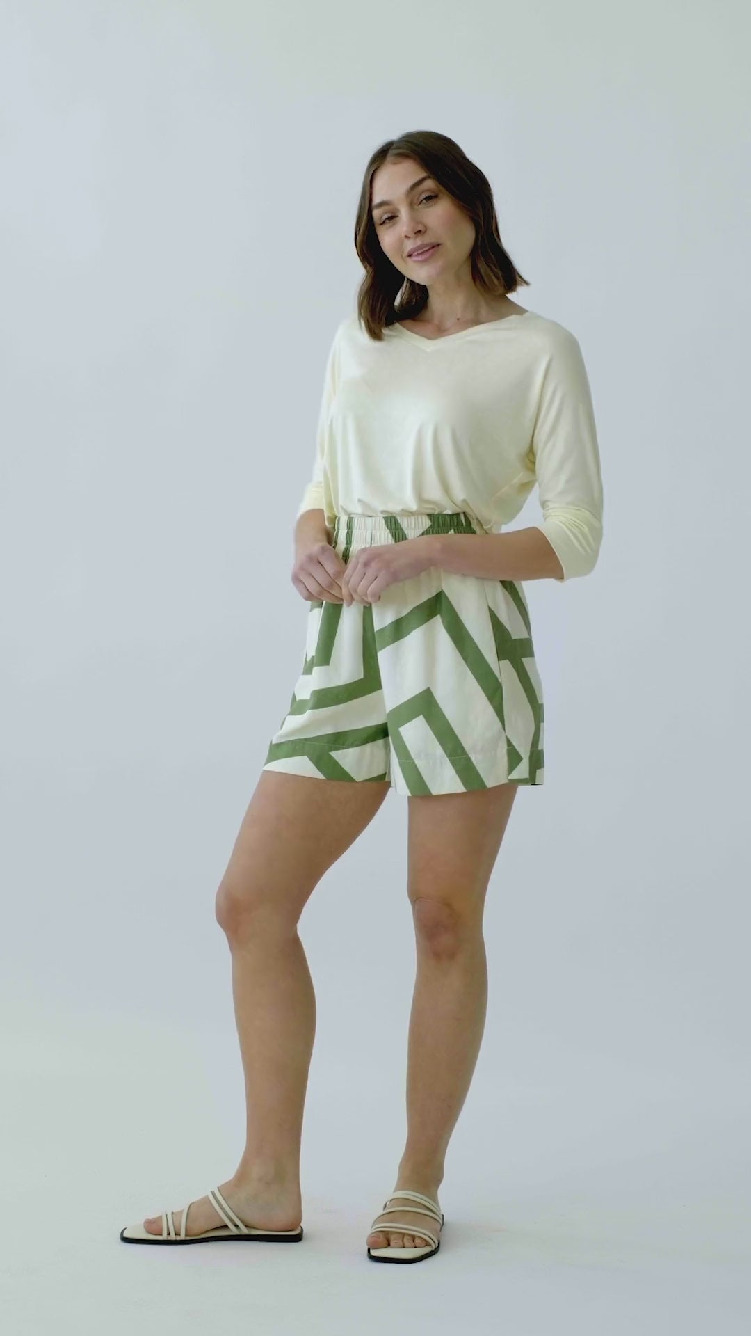 Embrace colour and pattern this summer with our Scandi Shorts! Crafted from a bamboo-linen blend, these relaxed, airy shorts are a must-have for your summer wardrobe. The bold geometric print, featuring garden green and warm vanilla tones, adds a playful and vibrant touch. Style them effortlessly with your favourite tops, or pair them with our matching Scandi Shirt for a chic, coordinated look. With a supportive elasticated waistband and side pockets, these shorts offer both comfort and ease. Versatile and effortless, they're sure to become a high rotation favourite this season.